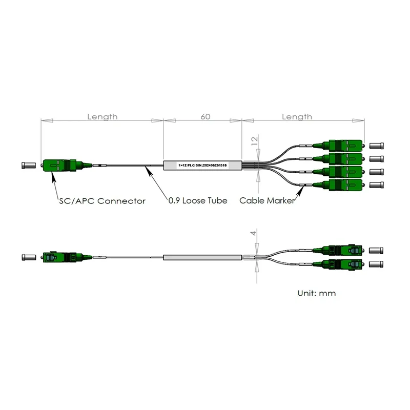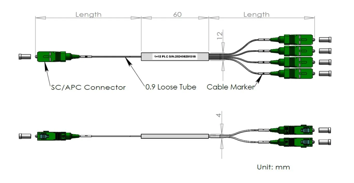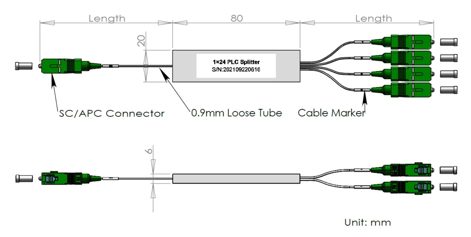 1x12/1 × 24 Plc Splitter Stahlrohrpaket 60x12x4 und 80x20x4mm, mit 900 μm loser Rohr 1,0+0,1/-0 m, SC/APC-Anschluss.Leistungsspezifikationen:ParameterSymbolSpezifikationenEinheitKanalnummerCh1 × 121 × 24Betriebswellenlänge1260 ~ 1650nmTestwellenlänge1310/1550nmSpektralverh&#......