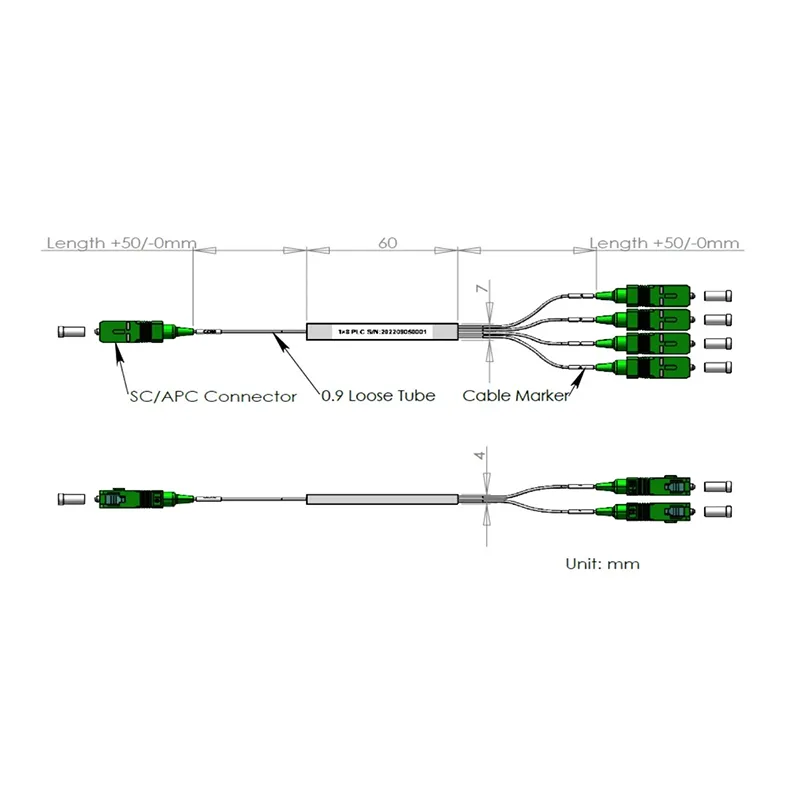 1 × 6 Plc Splitter Stahlrohrpaket 60 x 7 x 4 mm, mit 900 μm loser Rohr 1,0 +0,05/-0 m, SC/APC-Anschluss.Leistungsspezifikationen:ParameterSymbolSpezifikationenEinheitKanalnummerCh1 × 6Betriebswellenlänge1260 ~ 1650nmTestwellenlänge1310/1550nmSpektralverhältnis16,67%%Einf......