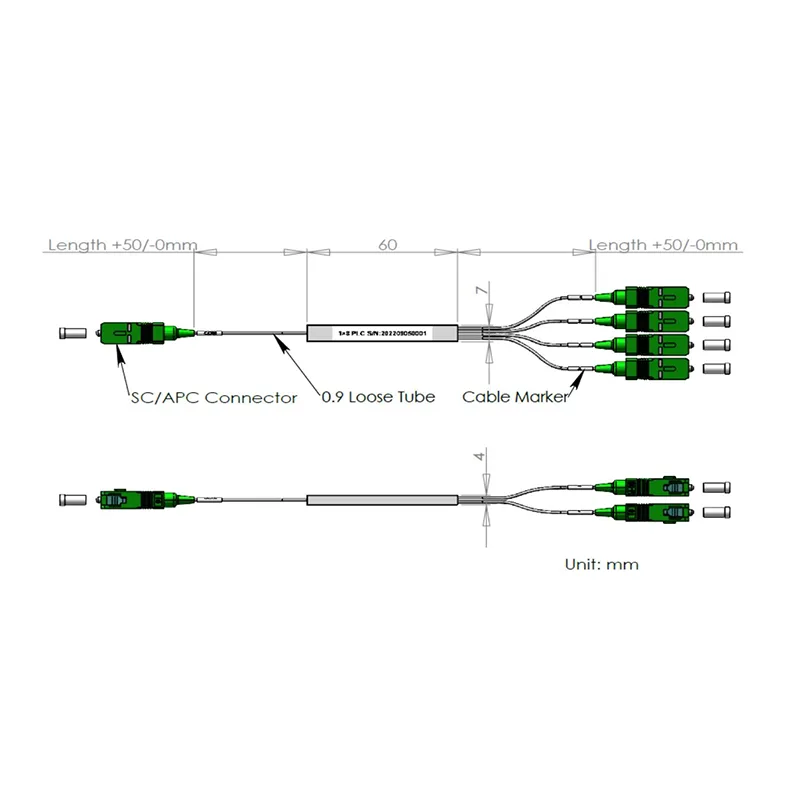 1 × 8 Plc Splitter Stahlrohrpaket 60 x 7 x 4 mm, mit 900 μm loser Rohr 1,0 und 0,75+0,05/-0 m, SC/APC-Anschluss.Leistungsspezifikationen:ParameterSymbolSpezifikationenEinheitKanalnummerCh1 × 8Betriebswellenlänge1260 ~ 1650nmTestwellenlänge1310/1550nmSpektralverhältnis12,5%%E......