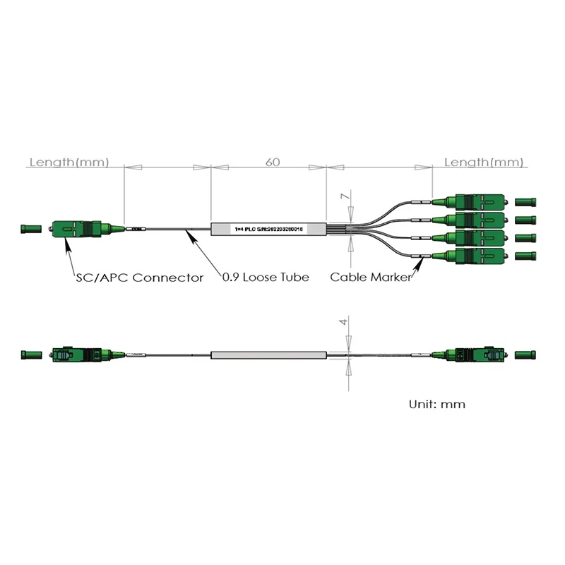1x4/1 × 8 Plc Splitter Stahlrohrpaket 60x7x4mm, mit 900 & mgr; m loser Rohr 1,0+0,1/-0 m, SC/APC-Anschluss.